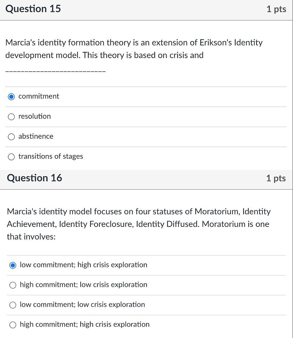 James marcia's adolescent identity development. In marcia's identity status model he describes four clearly differentiated identity statuses based on the amount of exploration and commitment that the adolescent is experiencing or has experienced. Identity strategy in which someone goes back and forth between moratorium & achievement. Identity moratoriums often occur during the late canadian developmental psychologist james marcia coined the phrase identity moratorium. Create your own flashcards or choose from millions created by other students.