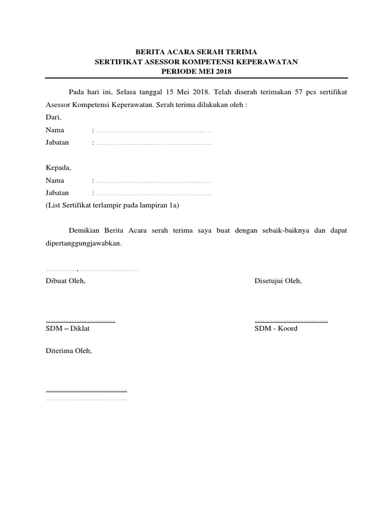 Contoh Surat Berita Acara Serah Terima Sertifikat Tanah Download Kumpulan Gambar from i2.wp.com Fotokopi kartu tanda penduduk (ktp) pemohon yang telah dilegalisir pejabat berwenang. Setelah dokumen lengkap kata dia, pemohon bisa langsung mengajukan untuk didaftarkan kemudian diberikan surat tanda terima (stt). Mengajukan permohonan sertifikat ke bpn. Adapun sertifikat hak milik tersebut adalah sebagai jaminan dari bapak muhammad anton atas pinjaman uang sejumlah rp. 31, minassa upa, dengan sertifikat no. Hal ini bisa menjadi bukti apakah penerimaan barang, uang, atau dokumen tersebut. Dokumen yang dimaksud juga bukan yang biasa saja, melainkan dokumen penting seperti yang berharga. Tambahkan tanda tangan bersertifikat ke pdf nama sertifikat kustom.